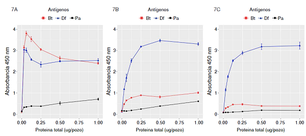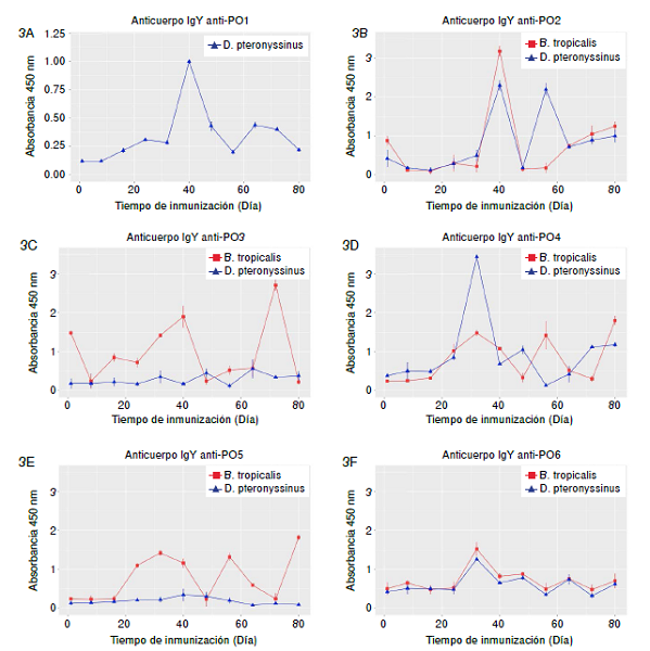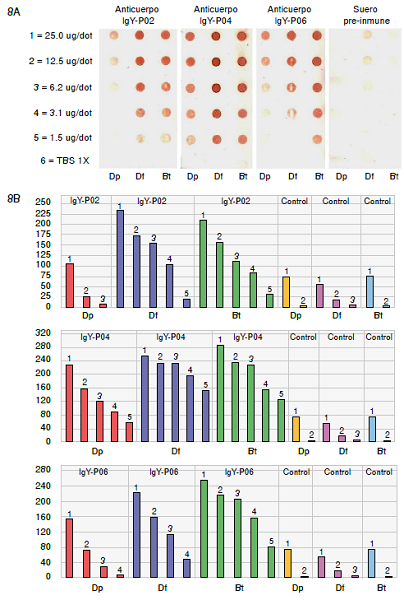 Las IgY antipéptidos P02, P04 y P06 purificadas por columna tiofílica fueron inmunorreactivas frente a los extractos alérgenos de ácaros D. farinae y B. tropicalis; sin embargo, las IgY antipéptido P02 fueron más reactivas al extracto de B. tropicalis, mientras que las IgY antipéptido P04 y P06 fueron más reactivas al ácaro D. farinae (figura 7A, B y C).