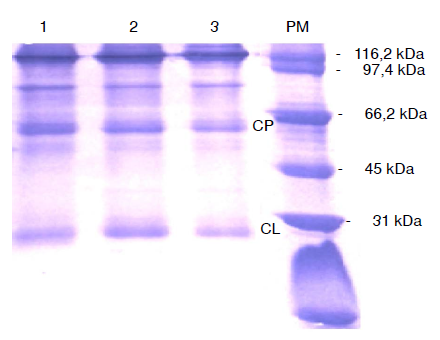El análisis de los extractos IgY mediante SDS-PAGE mostró dos bandas bien definidas, cuyos tamaños son cercanos a los reportados para las cadenas pesadas (67 kDa) y livianas (25 kDa) de la IgY 11. También se detectaron impurezas menores a nivel de los 110 kDa y una banda de alto peso molecular que podría ser la IgY completa (aproximadamente 160 kDa) (figura 4).