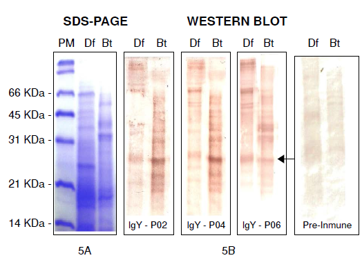 Para identificar las proteínas en los extractos de los ácaros reconocidas por las IgY purificadas se hizo un ensayo de Western blot. Brevemente, los extractos de proteínas de B. tropicalis y D. farinae (20 - 25 µg/carril) se separaron mediante electroforesis en gel de poliacrilamida con dodecilsulfato de sodio (sodium dodecyl sulfate polyacrylamide gel electrophoresis, SDS-PAGE), como se describió antes. Las proteínas se transfirieron del gel a membranas de nitrocelulosa de 0,2 µm (Trans-Blot® Transfer Medium de Bio-Rad), luego se lavaron con una solución reguladora salina con Tris (TBS 1X) pH 7,5 y se bloquearon durante dos horas en una solución de bloqueo (TBS 1X/ Tween-20 0,1 % v/v/leche descremada 2,5 % p/v). Cada membrana se incubó durante dos horas en una dilución de 1/250 de IgY antipéptido P02, antipéptido P04, antipéptido P06 y pre-inmunización. El exceso de anticuerpo se lavó con solución TBST (TBS 1X/ Tween-20 al 0,1% v/v). Las IgY unidas se detectaron con el conjugado anti-Chicken IgY- peroxidasa de rábano (HRP) (Promega® G1351) diluidoa 1/1000 en solución de bloqueo. El revelado se hizo con una solución compuesta por imidazol al 0,1 % y diaminobenzidina al 0,001 % disuelta en PBS 1x Triton X-100 0,1 %, y 15 µl de peróxido de hidrógeno 30 % al 0,05 %. Después de visualizadas las señales, la reacción se detuvo con agua destilada.