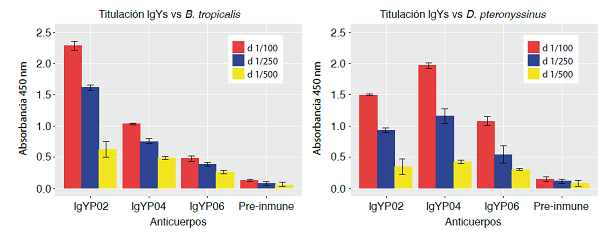 Un ensayo de ELISA con diferentes diluciones (1/100, 1/250 y 1/500) de los IgY purificados por columna tiofílica permitió establecer que las diluciones de 1/100 y 1/250 v/v mostraron las reactividades más altas comparadas con las IgY pre-inmunización; sin embargo, la dilución de 1/100 produjo las mejores reactividades contra ambos extractos de ácaros, D. pteronyssinus y B. tropicalis (figura 6 A y B).