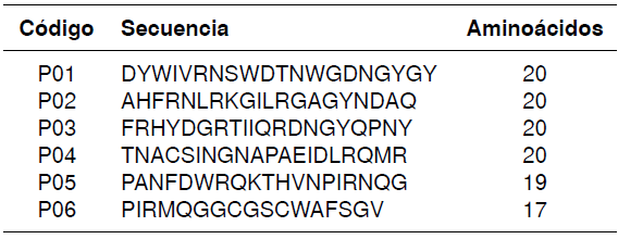 Los oligopéptidos se sintetizaron en el Instituto de Inmunología de la Universidad del Valle, Colombia, mediante el método en fase sólida F-moc en un equipo automatizado Advanced ChemTech APEX 396, se purificaron mediante cromatografía líquida rápida de proteínas (Fast protein liquid chromatography, FPLC), y posteriormente se liofilizaron. La pureza de los péptidos se verificó por cromatografía líquida de alta eficiencia en fase reversa (Reversed phase high-performance liquid chromatography,RP-HPLC). La identidad de cada péptido se confirmó por espectrometría de masas.
