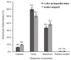 El mayor porcentaje de especímenes juveniles infectivos 'melanizados' se registró en el tórax de las larvas de C. quinquefasciatus, lo cual difirió significativamente del resto de las regiones corporales (F=20,37; gl=3; p<0,0001) (figura 5), en tanto que en A. aegypti, los mayores porcentajes se encontraron en el tórax y el abdomen, observándose diferencias significativas entre estas regiones corporales y las demás (F=11,53; gl=3; p<0,0001) (figura 5).