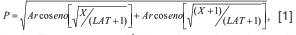 donde P es la proporción transformada de la longitud de la mancha de la vena costal con respecto a la longitud total del ala, X es la longitud de la mancha en mm y LAT es la longitud del ala en mm.