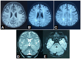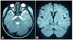 La resonancia magnética (RM) cerebral simple practicada a los 10 meses, mostraba leucoencefalopatía parieto-occipital, e hiperintensidad del tracto tegmental central y de los núcleos delgado y cuneiforme (figura 1). En el electroencefalograma (EEG) se evidenció actividad epileptiforme focal témporo-parietal izquierda. Con los estudios metabólicos se descartó aminoacidopatía, aciduria orgánica, leucodistrofia metacromática y enfermedad del peroxisoma.