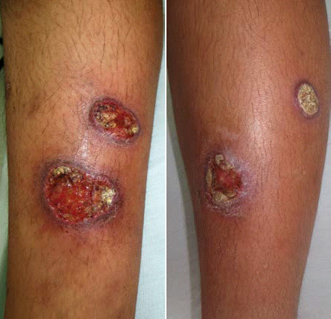 Se encontraron cuatro úlceras crateriformes, dos en cada pierna, de 3-4 por 2 cm, no dolorosas (figura 1). No había adenopatías y la mucosa nasal era normal.