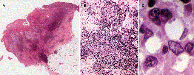 En la revisión de la biopsia se encontró piel ulcerada con hiperplasia pseudocarcinomatosa e inflamación dérmica difusa granulomatosa, con macrófagos vacuolados y abundantes plasmocitos, así como un único conglomerado intradérmico de leucocitos polimorfonucleares y ocasionales amastigotes fagocitados (figura 2).