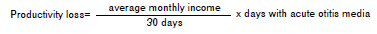 To estimate the loss of productivity in terms of money, we asked about the income of the breadwinner and the work time lost, which were associated with the disease for each episode of acute otitis media.