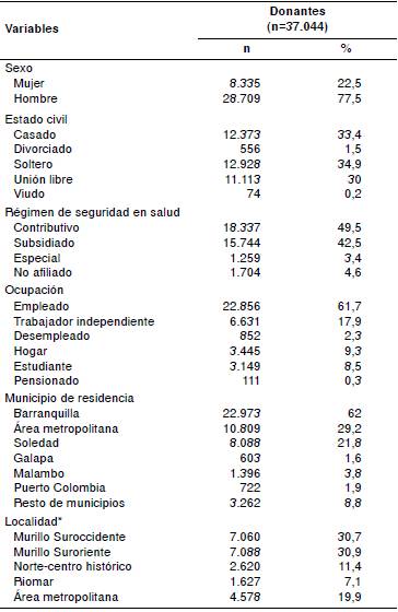 Durante el periodo de este estudio, se analizaron 37.044 registros de donantes de sangre. La mayoría de estas donaciones provenía de hombres (77,5 %); el grupo etario que más hizo donaciones fue el de 29 a 38 años de edad (25,5 %). La mayoría de los donantes eran empleados, 61,7 % vivía en pareja, 63,4 % pertenecía al régimen contributivo y el 92% al subsidiado y el 62 % residía en la ciudad de Barranquilla y el 29,2 % en municipios de su área metropolitana. La mayoría de las donaciones (81,5 %) en Barranquilla provenía de personas residentes en las localidades ubicadas en el sur de la ciudad: Murillo Suroriente, Murillo Suroccidente y Metropolitana (cuadro 1).