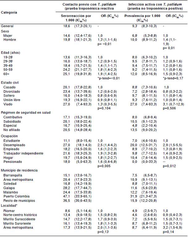 Results: We found a seroreactivity of 1.86% in individuals with previous T. pallidum infection, and a prevalence of 0.93% in those with active T. pallidum infection. These values were higher in adult men and older adults, widowers, the unemployed, and people living in municipalities of the Department of Atlántico other than Barranquilla and its metropolitan area. The incidence of syphilis infection showed a significant association with sex and occupation.