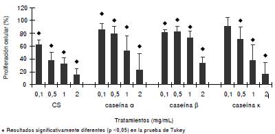 Resultados. : Se encontró que el caseinato de sodio y las caseínas α, β y κ reducían la proliferación de la línea celular 32Dcl3 sin afectar la viabilidad, y que solo el caseinato y la caseína α inducían la apoptosis y la liberación al medio de TNF-α. La proliferación de células 32Dcl3 tratadas con caseinato y caseína α se restableció al usar anticuerpos anti-TNF-α.