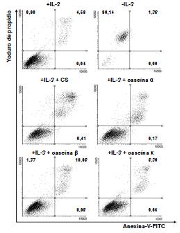 Una forma de evaluar el compromiso indicativo de un posible daño celular es la detección de la translocación de la fosfatidilserina de la cara interna a la externa de la membrana celular, lo que indica apoptosis. Los datos obtenidos de la citometría de flujo indicaron que el 23, el 16, el 10 y el 8 % de la población presentó translocación en la región de apoptosis tardía en presencia de caseinato de sodio, y de las caseínas α, β o κ, respectivamente, mientras que en el control esta proporción fue de 4 % (figura 2).