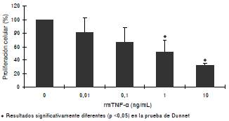 Al constatar que el TNF intervenía en la inhibición de la proliferación de las células 32Dcl3, se procedió a demostrar que estas eran sensibles al efecto del TNF-α recombinante. Los resultados indicaron que sí inhibió la proliferación de 32Dcl3 según la dosis utilizada (figura 3). Una vez se evidenció que el TNF-α recombinante inhibía la proliferación de las células 32Dcl3, se procedió a avaluar si el TNF-α producido por las células 32Dcl3 tratadas con caseinato de sodio o caseína α era el responsable de inhibir la proliferación. El uso de anticuerpos anti-TNF-α de ratón en células 32Dcl3 tratadas con caseinato de sodio y caseína α previno la inhibición de la proliferación en más de 80 % en las células tratadas con caseinato de sodio y en 100 % en las células tratadas con caseína α (figura 4).