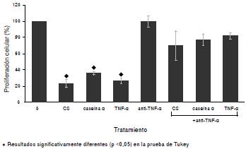 Se ha demostrado que el caseinato de sodio y la caseína α son capaces de inhibir la proliferación en las células mieloides 32Dcl3 de ratón 12. En este trabajo se muestra que estimulan la liberación del TNF-α, el cual es el principal agente supresor de la proliferación en las células tratadas con caseinato de sodio y el responsable de la inhibición mediada por la caseína α.