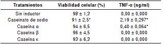 La inducción de la apoptosis puede ser mediada por TNF-α, por lo que al evaluar su presencia en el medio condicionado de células con tratamiento de caseinato de sodio o caseínas, o sin este, la prueba de ELISA evidenció que 2 mg/ml de caseinato de sodio y 1 mg/ml de caseína α inducían la liberación de dicho factor (cuadro 1). En este sentido, aun cuando la adición de la caseína β o la κ redujo de manera significativa la proliferación, los resultados del ELISA indicaron que no inducían la liberación del TNF-α.