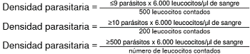 Concordancia de recuento (densidad parasitaria): se evaluó la capacidad para contar la cantidad de parásitos por microlitro (µl) de sangre y la concordancia con la densidad parasitaria del laboratorio referente. Se consideró como concordante un recuento que no tuviera una diferencia mayor de ±50 % con respecto al del laboratorio referente.