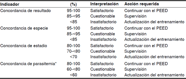 Las concordancias de los resultados y de especies fueron los indicadores seleccionados para aprobar la evaluación de la idoneidad por considerarse variables determinantes para el diagnóstico. Las concordancias de estadio y de recuento tienen menos impacto en el resultado y se afinan con las actividades de control de calidad e intervenciones regulares 6.
