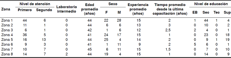 A los microscopistas del sector público en el nivel local de las zonas 1 a 8 se les solicitaron los datos referentes a la edad, el nivel educativo, el sitio de trabajo y la experiencia, para contar con una base de datos más completa de los integrantes de la red, útil para su análisis y como insumo para el nivel intermedio y el nacional.