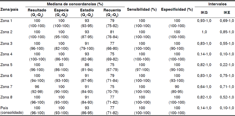 Materials and methods: We conducted a cross-sectional study based on the information collected in workshops carried out to appraise the competence for microscopic diagnosis of the local laboratory network (zonal health coordinating offices 1 to 8) using a slide panel to evaluate diagnosis agreement, as well as the diagnostic performance of the intermediate laboratories using an external quality assessment program. The results were compared against the reference standards of the supranational laboratory in Perú.