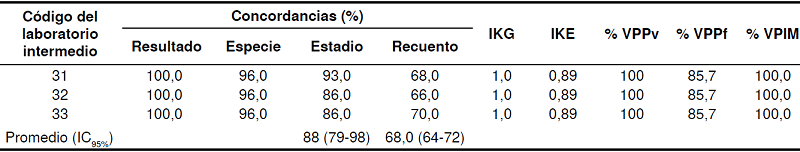 Por otra parte, el desempeño alcanzado por los laboratorios intermedios fue satisfactorio en cuanto a las concordancias de resultado, especie y estadio; sin embargo, es necesario continuar organizando actividades para mejorar la concordancia de recuento en los laboratorios de referencia.