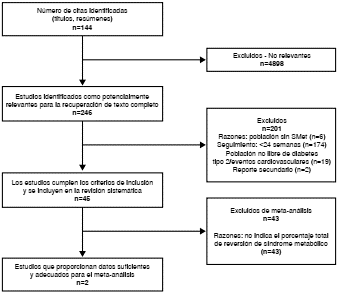 Los dos estudios informaron adecuadamente sobre los criterios de inclusión en el análisis y los porcentajes de reversión del síndrome metabólico, pero solo en uno se reportaron las OR de la reversión para el tratamiento y el correspondiente intervalo de confianza para la estimación.