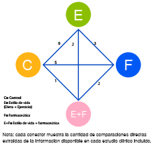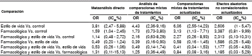 En todos los análisis, se utilizó la comparación por pares de cada una de las intervenciones: la de control, la relacionada con el estilo de vida o con los fármacos y la combinación de estas dos. En la compilación de ambos modelos, se incorporaron solo seis de los trece artículos del estudio de base y los dos artículos detectados en la búsqueda durante el periodo adicional de observación, esto, con la finalidad de mantener la relación en la red de tratamientos durante la convergencia de los modelos, por lo que la estimación de la OR correspondió a la síntesis de las medidas reportadas en ocho de los artículos.