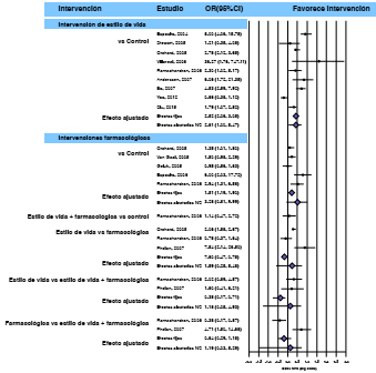 Los contrastes más frecuentes (nueve artículos), se hicieron entre el estilo de vida y el grupo de control: Esposito, et al., 2004 29; Stewart, et al., 2005 36; Orchard, et al., 2005 33; Villareal, et al., 2006 38; Ramachandran, et al., 2006 35; Anderssen, et al., 2007 26; Bo, et al., 2007 28; Yoo, et al., 2012 24 y Siu, et al., 2015 25. Además, en cinco artículos se compararon tratamientos con esquemas farmacológicos versus un grupo control: Orchard, et al., 2005 33; van Gaal, et al., 2005 37; Geluk, et al., 2005 31; y Esposito, et al., 2006 30, y Ramachandran, et al., 2006 35.