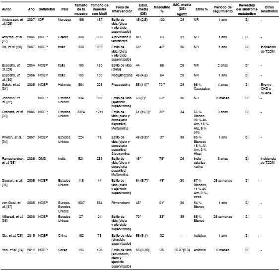 Se utilizó la definición del NCEP como criterio de inclusión de los estudios en el metaanálisis. Con respecto a la duración de los estudios, se tuvieron en cuenta períodos de seguimiento a partir de 24 semanas y hasta cuatro años. La edad media de los participantes y el índice de masa corporal, variaron de 44 a 70 años y de 25,6 a 39 kg/m 2 , respectivamente. El porcentaje de hombres fluctuó entre 21 y 100 %. Tal como en el estudio de base, se definió la reversión del síndrome metabólico según la proporción de individuos con diagnóstico positivo en el estado inicial del estudio y cuya condición cambió en el curso del seguimiento.