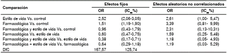 En el cuadro 2, se presenta la comparación entre el método de efectos fijos y el método de efectos aleatorios no correlacionados, y las intervenciones comparadas con los tratamientos. Se observa que, en ambos modelos, las intervenciones relacionadas con el estilo de vida y la utilización de un fármaco obtuvieron OR mayores de 1 con respecto al grupo de control, lo que evidencia que son efectivas para revertir el diagnóstico de síndrome metabólico. Cabe destacar que el modelo de efectos aleatorios no correlacionados contradice lo obtenido con el de efectos fijos con respecto al cambio del estilo de vida en conjunto con un fármaco; este tratamiento conjunto fue beneficioso para revertir el síndrome al usar el modelo de efectos aleatorios no correlacionados y hacer la comparación con el grupo control.