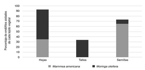 En M. oleífera se aislaron endófitos de los tres tejidos vegetales, con un porcentaje mayor en hojas (58 %); en los tallos fue de 34 % y en las semillas, de 8 %. En M. americana, por el contrario, la mayoría (65 %) de los endófitos se obtuvieron de la semilla, y el resto se obtuvo de las hojas (figura 1).