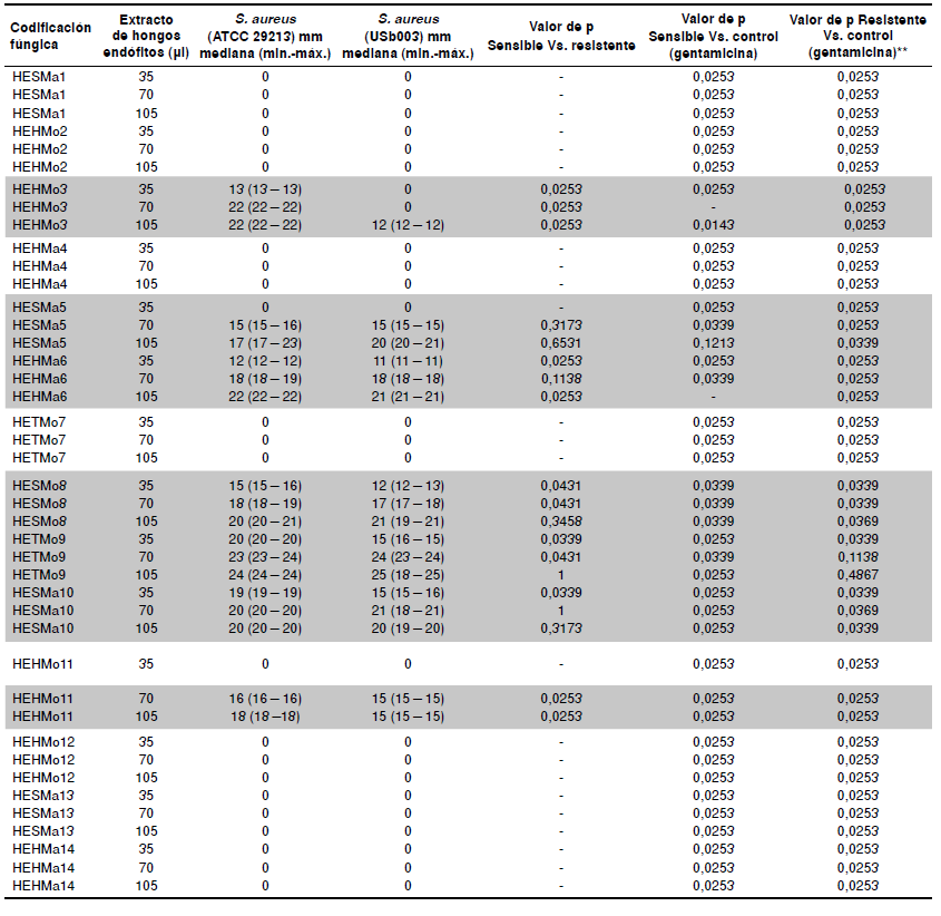 La actividad antimicrobiana de los extractos etanólicos fúngicos de los endófitos fue diferente para las cepas de S. aureus sensibles y para las resistentes, con un rango de halos de inhibición de 13 a 24 mm y de 12 a 25 mm, respectivamente, siendo estos valores estadísticamente significativos con relación al control de gentamicina (cuadro 2).