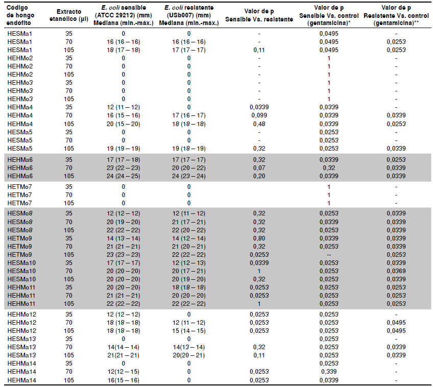 En los cuadros 2 y 3, se comparan los halos de inhibición del crecimiento bacteriano de las cepas sensibles y resistentes de S. aureus y E. coli con diferentes concentraciones de extractos etanólicos de hongos endófitos y el control de gentamicina (prueba estadística de Mann-Whitney).