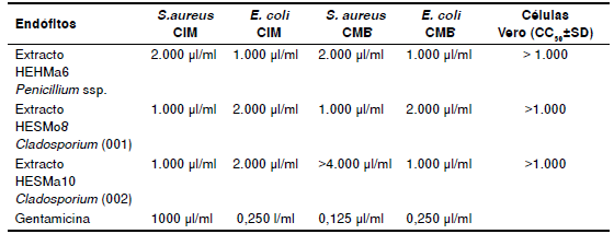 Resultados. : Tres extractos etanólicos de Penicillium sp., Cladosporium sp. (001) y Cladosporium sp. (002) presentaron mayores halos de inhibición en cepas sensibles y resistentes de E. coli y S. aureus. La CMI y la CBM halladas fueron estadísticamente significativas (p≤0,05), comparadas con el control de gentamicina. Las pruebas de citotoxicidad (concentración citotóxica, CC50>1.000) demostraron que los hongos endófitos poseen características bactericidas y no ocasionan daño alguno.
