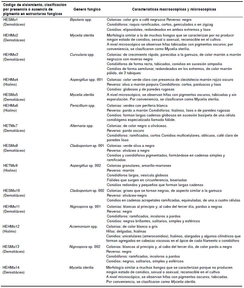 Los 14 hongos filamentosos aislados de los tejidos de M. americana y M. oleifera que presentaron actividad anti microbiana contra E. coli y S. aureus, se identificaron por sus características macroscópicas y microscópicas como miembros de las divisiones Ascomycota y Deuteromycota. Un alto porcentaje (85 %) de ellos se clasificó como miembro de Ascomycota y, de estos, un 75 % presentó pigmentos intrínsecos en sus hifas y esporas, por lo cual se clasificaron como Dematiáceos. El 25 % correspondió a hongos de hifas hialinas (cuadro 5). Los hongos clasificados como Deuteromycota se catalogaron como de micelio estéril, ya que sus géneros pertenecen a hongos imperfectos que no presentan esporulación y representaron solo el 15 % de los 14 hongos aislados con actividad antimicrobiana contra las dos bacterias ensayadas (cuadro 5 y figura 2).