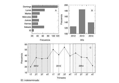 En el cuadro 1, también se puede apreciar cómo la mayoría de los casos de trauma fueron consecuencia de accidentes de tránsito (91,4%) y que los motociclistas fueron el grupo más afectado (47,5 %). En el 12,8 % de los casos se informó que los pacientes se encontraban en estado de embriaguez en el momento del trauma; sin embargo, es importante enfatizar que estos datos son completamente subjetivos, ya que los protocolos locales de manejo del trauma craneoencefálico no incluyen la alcoholemia como prueba de rutina y en muchos casos esta variable no se informa. En la figura 1A se aprecia que la frecuencia de este tipo de trauma aumentó a medida que aumentó la de los accidentes de tránsito, especialmente los fines de semana (sábado y domingo) y los lunes, días en que se registra mayor consumo de alcohol entre la población general.