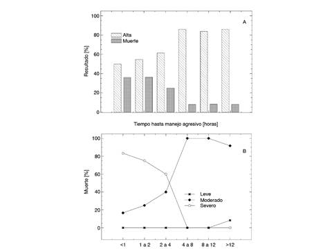 Cuando se calculó el tiempo transcurrido entre el ingreso y el inicio del tratamiento agresivo, se observó que, en el grupo en el que dicho tiempo fue de menos de una hora, murieron 18 de 50 pacientes, es decir, el 36,0 %, en tanto que la letalidad en los otros grupos fue igual o inferior (figura 2B), lo cual sería contradictorio, pues se esperaría que, a medida que dicho tiempo disminuye, la tasa de supervivencia aumente. Sin embargo, la mayor letalidad observada en el grupo tratado agresivamente en las primeras dos horas, se debe a la gravedad del trauma, pues el tratamiento agresivo se recomienda para puntuaciones de menos de 8 en la escala de Glasgow, es decir, para el trauma craneoencefálico grave, en el cual se espera una mayor letalidad.
