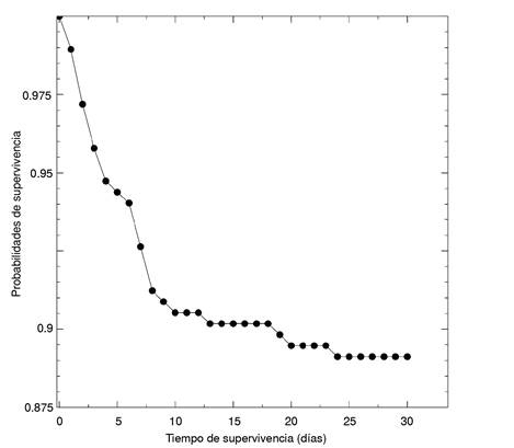 Esta observación se hace evidente cuando se analiza cada subgrupo de gravedad por separado en función del tiempo transcurrido entre el ingreso y el tratamiento agresivo, y la condición final del paciente, como se observa en la figura 2A. Se demuestra así que el acentuado efecto de la demora en la implementación de medidas agresivas afecta principalmente al grupo de pacientes con trauma inicialmente clasificado como moderado, grupo en el que quienes fueron tratados en el curso de la primera hora presentaron una letalidad de menos de 20,0 %, con un notable aumento de la letalidad a medida que aumentaba el tiempo de instauración del tratamiento agresivo, y una letalidad cercana al 100 % cuando dicho tiempo excedió las 4 a 8 horas. Además, el análisis de Kaplan-Meier evidenció que la probabilidad de supervivencia disminuyó por debajo de 0,9 cuando la hospitalización se prolongaba más de 10 días (figura 3).