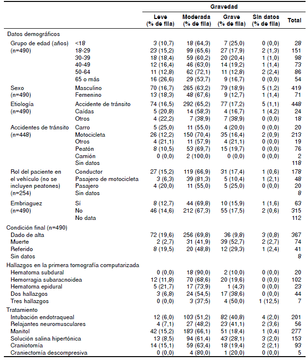 Al analizar el número de muertes por subgrupos según la gravedad, el 2,7 % correspondió a traumas leves, el 41,9 % a moderados y el 52,7 % a graves, es decir, hubo un número importante de pacientes cuya clasificación inicial y manejo subsecuente habrían sido inadecuados. En el 8,4 % de los casos no se registró la información sobre la condición final de los pacientes porque fueron referidos a otras instituciones durante su hospitalización.