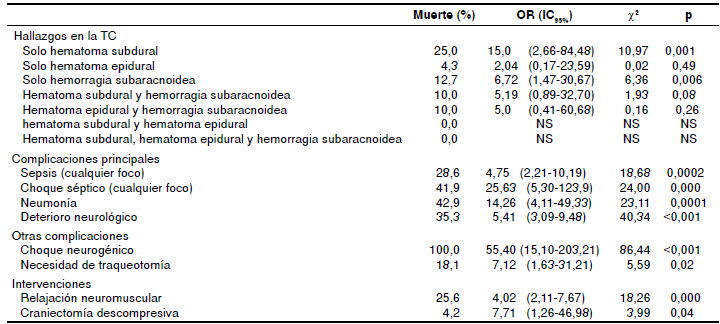 La necesidad de bloqueadores neuromusculares durante la administración de respiración mecánica asistida, también se correlacionó con un aumento de la letalidad (OR=4,03; IC95% 3,26-4,98), ya que este es sugestivo de hemorragia endocraneal y trauma craneoencefálico grave. Además, la decisión de practicar una craniectomía también se asoció con la muerte (OR=7,71; IC95% 1,46-40,81), lo que puede atribuirse al hecho de que, por lo general, esta es una intervención tardía en pacientes con hemorragia endocraneal que no mejoran con el tratamiento médico o temprano cuando se basa en los hallazgos específicos en la TC de ingreso indicativos de hemorragia endocraneal grave, que ya, per se, indican un mal pronóstico. Por el contrario, la asociación con la muerte no fue significativa en el caso de craneotomías para el drenaje de lesiones que ocupan espacio (p<0,94), lo que podría explicarse por el hecho de que, en muchos casos, esta técnica se emplea tempranamente a partir de hallazgos de lesiones que ocupan espacio sin evidencia de hemorragia endocraneal grave en la tomografía.