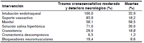 Cabe señalar que el 32,7 % de los casos inicialmente clasificados con trauma moderado requirieron intubación endotraqueal, lo que indica que en algún punto de su evolución presentaron deterioro neurológico, entendido este como una caída en el puntaje de la escala de Glasgow de ≤8 en las primeras 72 horas a partir del momento del trauma. Todos los pacientes en este grupo recibieron tratamiento hiperosmolar, pero hubo un menor uso de solución salina hipertónica (29,8 %) en comparación con el grupo con trauma grave (100 %), en tanto que el uso de manitol (58,4 %) y las cirugías craneales (20,0 %) se presentaron en una proporción similar en ambos grupos.