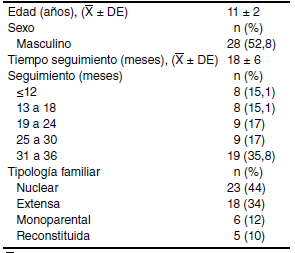 Se incluyeron 53 niños y adolescentes que ingresaron al programa de obesidad del Hospital Universitario de San Vicente Fundación, entre enero de 2012 y abril de 2015. El tiempo promedio de seguimiento fue de 18 ± 6 meses. El 15 % de los niños tuvo un seguimiento de 12 meses o menos, y el 30 %, de 31 a 36 meses, en tanto que el 52,8 % tuvo un seguimiento, por lo menos, de dos años (cuadro 1).