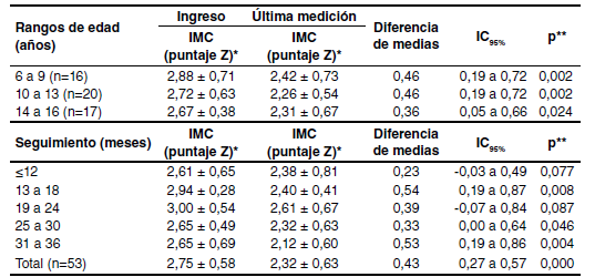 Al evaluar el cambio en el IMC discriminando por subgrupos de edad, se encontró que todos registraron una reducción significativa del puntaje Z, siendo similar el cambio en niños de 6 a 9 años y de 10 a 13 años. En los adolescentes entre los 14 y los 16 años, hubo menos disminución, pero aun así fue estadísticamente significativa (cuadro 2).