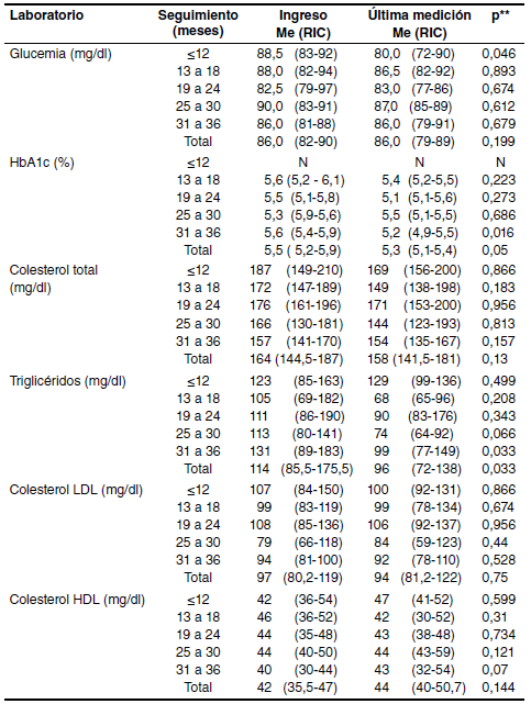 Al analizar específicamente la HbA1c de los pacientes del programa, se evidenció que la proporción de niños con valores anormales disminuyó entre el ingreso y el último control 60. En el 79 % de los pacientes del programa, la mediana de la medición de la HbA1c en el ingreso fue de 5,5 % (RIC: 5,2-5,9 %) y en la última evaluación estos valores bajaron a 5,3 % (RIC: 5,15,4 %). Según estos resultados, se observa inicialmente un rango de HbA1c correspondiente a una prediabetes (ADA: 5,7-6,4 %) 60. Al estratificar por tiempo de seguimiento, se encontraron diferencias estadísticas en dicha disminución solo en los pacientes con un seguimiento de más de 31 meses, lo que refleja indirectamente la mejoría del perfil del metabolismo de la glucosa en los sujetos con más tiempo de seguimiento en el programa. Los demás subgrupos en esta categoría no evidenciaron cambios significativos, pero no se descarta que haya sido por efecto del tamaño de la muestra.