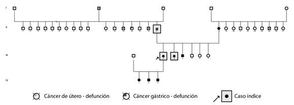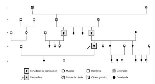 Materials and methods: We conducted a descriptive and cross-sectional study of six index cases with breast cancer positive for BRCA1 3450del4 that fulfilled three of the criteria established by Jalkh, et al. The genealogical trees were made using the information of the interview data (GenoPro™, version 2016). The mutation was typified in healthy and affected relatives who agreed to participate.