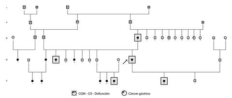 Las figuras 1 a 6 corresponden a los árboles genealógicos de los seis casos índice estudiados e incluyen la información molecular directa únicamente de las personas seleccionadas que voluntariamente aceptaron participar en el estudio y del caso índice con la variante patogénica BRCA1 3450del4; esta información se complementó con los datos indirectos derivados de las entrevistas anexas a cada una de las muestras, especialmente en cuanto a los diferentes tipos de cáncer.
