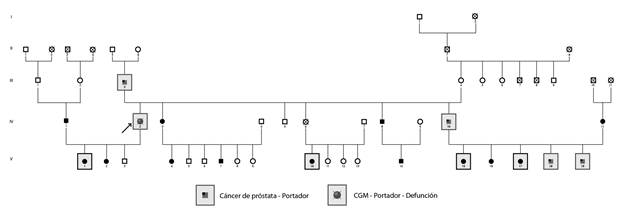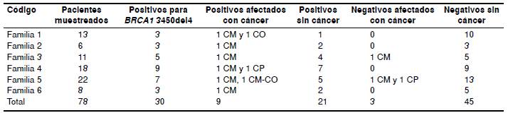 Resultados. : De los 78 individuos seleccionados por conveniencia en las seis familias, 30 presentaron la mutación BRCA1 3450del4; de ellos, seis tenían cáncer de mama, uno, cáncer de ovario, uno, cáncer de mama y ovario, y otro, cáncer de próstata; 21 no presentaban neoplasias. De los 30 individuos portadores de la variante patogénica, seis eran hombres y 24 mujeres, 13 de ellas menores de 30 años.