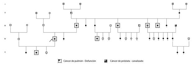 Materiales y métodos. : Se hizo un estudio descriptivo y transversal de seis casos índice con cáncer de mama positivos para BRCA1 3450del4, que cumplían tres de los criterios establecidos por Jalkh, et al. A partir de la información de las entrevistas, se realizaron los árboles genealógicos (GenoPro™, versión 2016). Se tipificó la mutación en familiares sanos y afectados que aceptaron participar.
