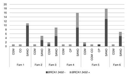 En la figura 7 se presenta la asociación del cáncer con la presencia de la variante patogénica BRCA1 3450del4 en cada una de las seis familias, y se evidencia que los tipos más comunes de cáncer en estas familias eran el cáncer de mama y el cáncer de ovario.