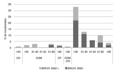 En el gen BRCA1 del cromosoma 17q21, se han descrito 600 variantes alélicas, aproximadamente, entre ellas, la patogénica 3450del4, ubicada en el exón 11, como resultado de la deleción del codón Gln 1111 (CAA) y el primer nucleótido (G) del codón 1112, lo que produce un codón de terminación anticipada en la posición 1115 12. Esta es una de las mutaciones fundadoras de riesgo presentes en el país: en 12 de los 766 casos de cáncer de mama estudiados por Torres, e tal., en el 2009 13 y en 11,5 % de los casos de cáncer de ovario estudiados por Rodríguez, et al.14, en tanto que en el artículo de revisión de Ossa, et al., se reporta en Brasil y Chile 15.