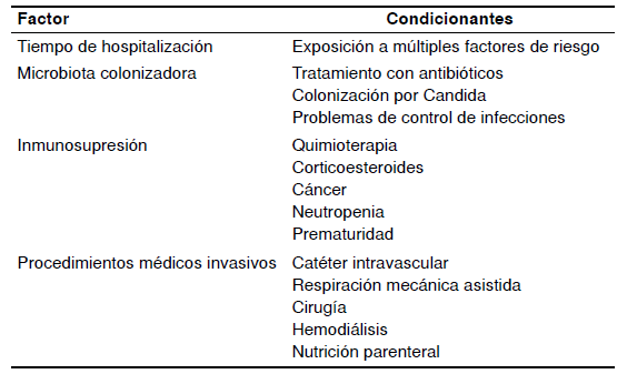La gravedad de la enfermedad implica factores adicionales de riesgo, como el uso de antibióticos de amplio espectro, las cirugías mayores, la nutrición parenteral total y el uso de dispositivos invasivos como sondas y catéteres 8. Otros factores de riesgo descritos son la duración de la estancia hospitalaria, la edad avanzada, la presencia de múltiples comorbilidades, la diabetes mellitus, los trasplantes, las enfermedades neoplásicas, la cirugía gastrointestinal, los implantes protésicos, los tratamientos inmunosupresores, la pancreatitis, la desnutrición, las quemaduras graves, el trauma, la colonización previa por Candida spp., la falla renal aguda -principalmente en pacientes con diálisis-, el compromiso del sistema inmunológico, el bajo peso al nacer, la neutropenia, la hospitalización en unidades de cuidados intensivos, la disfunción orgánica que requiere procedimientos invasivos como la asistencia respiratoria mecánica, los medicamentos vasoactivos, la diálisis, la circulación extracorpórea, las transfusiones y la traqueotomía, entre otros (cuadro 1) 2,7,9,10. Un estudio realizado en tres instituciones de diferentes partes de Colombia, validó la frecuencia e importancia de los factores de riesgo mencionados 11.