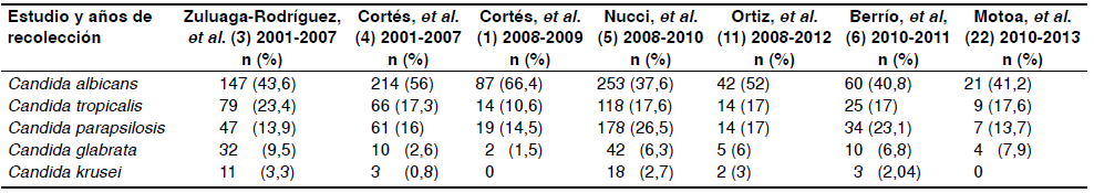 La frecuencia de las diferentes especies de Candida en Colombia se presenta en el cuadro 21,3-6,11,22. Se observa que los datos tomados en su conjunto reflejan una disminución de la frecuencia relativa de C. albicans, con incremento de otras especies, especialmente C. parapsilopsis. También, se ha observado un incremento relativo de la frecuencia de C. glabrata. No es claro el significado de estos cambios, aunque algunas especies, como C. parapsilosis, parecen tener mayor facilidad para colonizar a los trabajadores de la salud y formar biopelículas, lo cual favorecería su transmisión cruzada y podría explicar parcialmente los cambios observados 13,14,23.